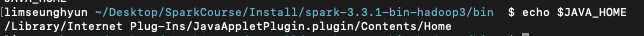 export SPARK_HOME=<압축을 풀었던 경로> e.g) export SPARK_HOME=/Users/limseunghyun/Desktop/SparkCourse/Install/spark-3.3.1-bin-hadoop3