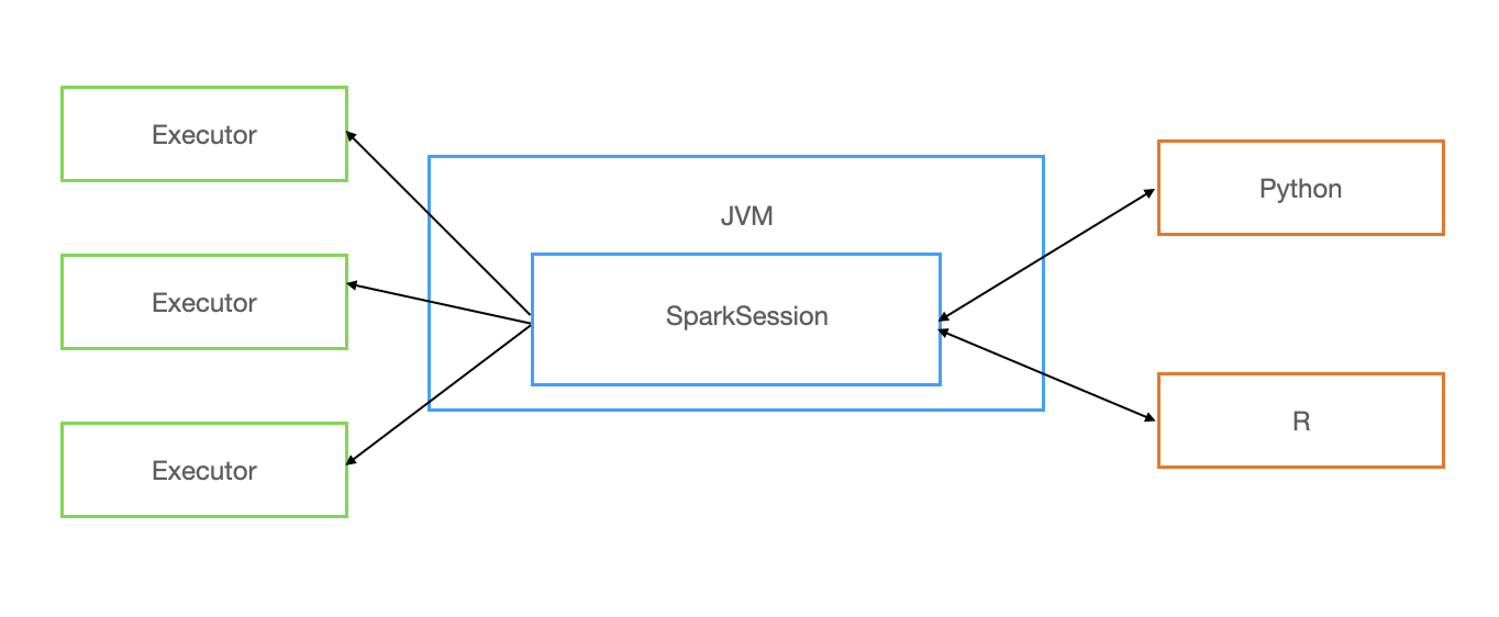 - SparkSession을 통해 JVM에서 실행할 수 있는 코드로 변환해주고, 변환된 코드는 Executor로 전달한다.
