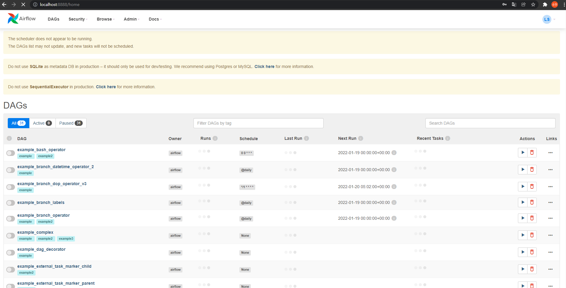 - Airflow Home 화면에 "The scheduler does not appear to be running"은 스케쥴러 실행을 통해 해결