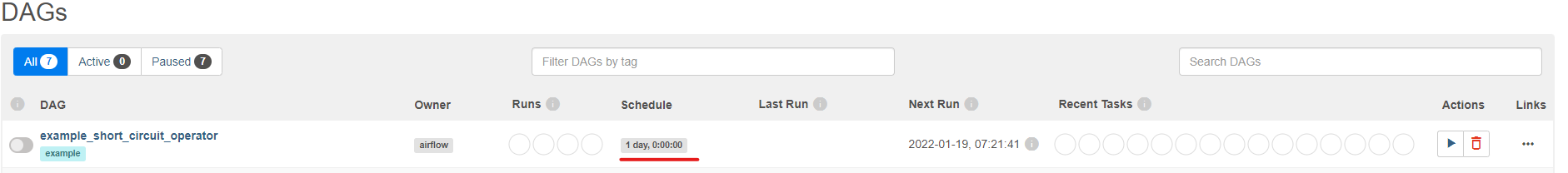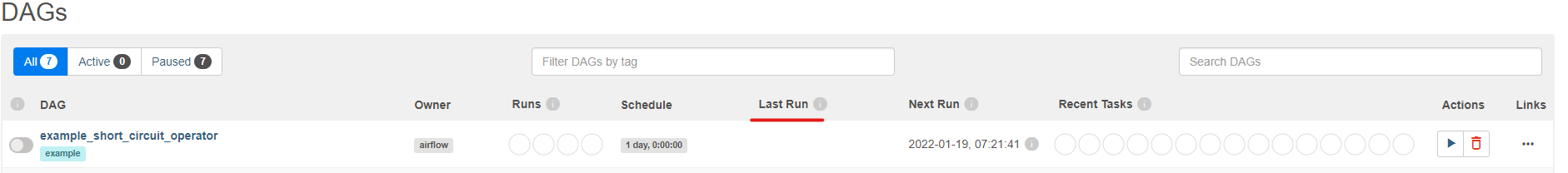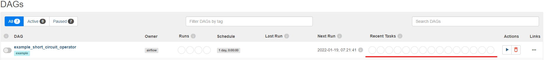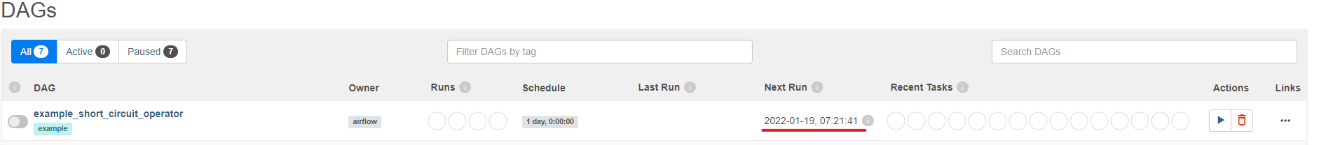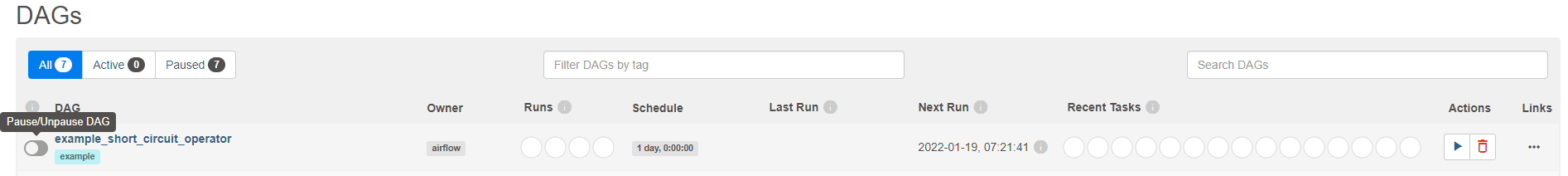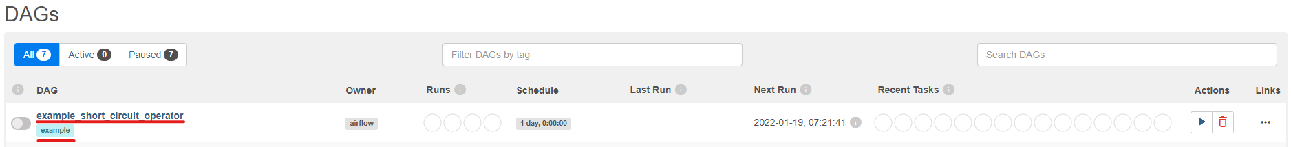 - example_short_circuit_operator이라는 dag name이고, example이라는 tag가 있다.