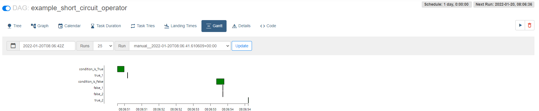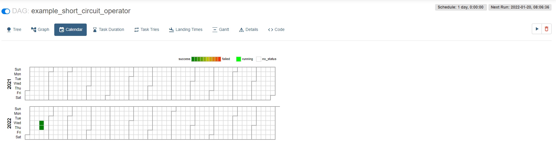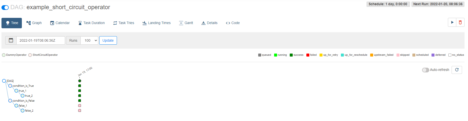 airflow의 sample dag 중 example_short_circuit_operator를 실행하고 위의 페이지에서 정리해두었던 페이지 외에 DAG의 Tree, Graph, Calender 등에 관한 페이지 정리 내용입니다.