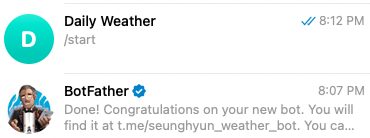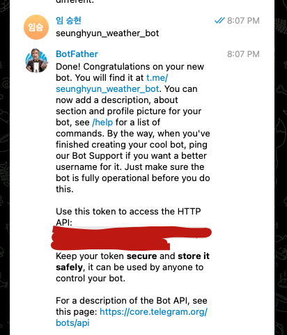 - 봇 생성이 완료되면 Daily weather 채널이 생성되었고 Bot 접근이 가능한 Access Token이 생성된 것을 확인할 수 있다.